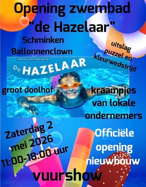 Op zaterdag 2 mei 2026 vieren wij van 11:00 tot 18:00 uur de feestelijke opening van het vernieuwde zwembad “De Hazelaar” in Hazerswoude-Dorp!